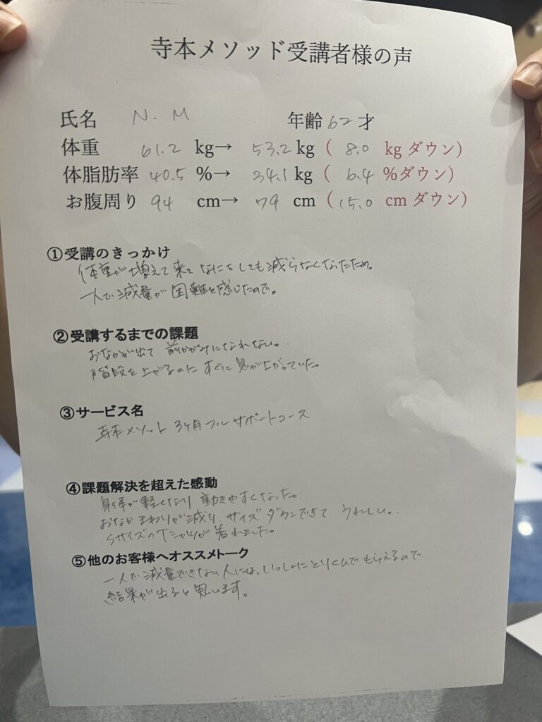 (NO.76)【62才NM様】体重8.0kgダウン・体脂肪率6.4%ダウン!60代から若返る寺本メソッドの成功事例