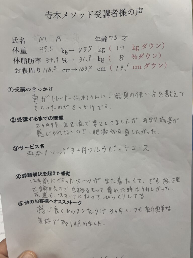 (NO.78)【73才MA様】体重10.0kgダウン・体脂肪率8.0%ダウン!70代でも若返る寺本メソッドの奇跡の変化
