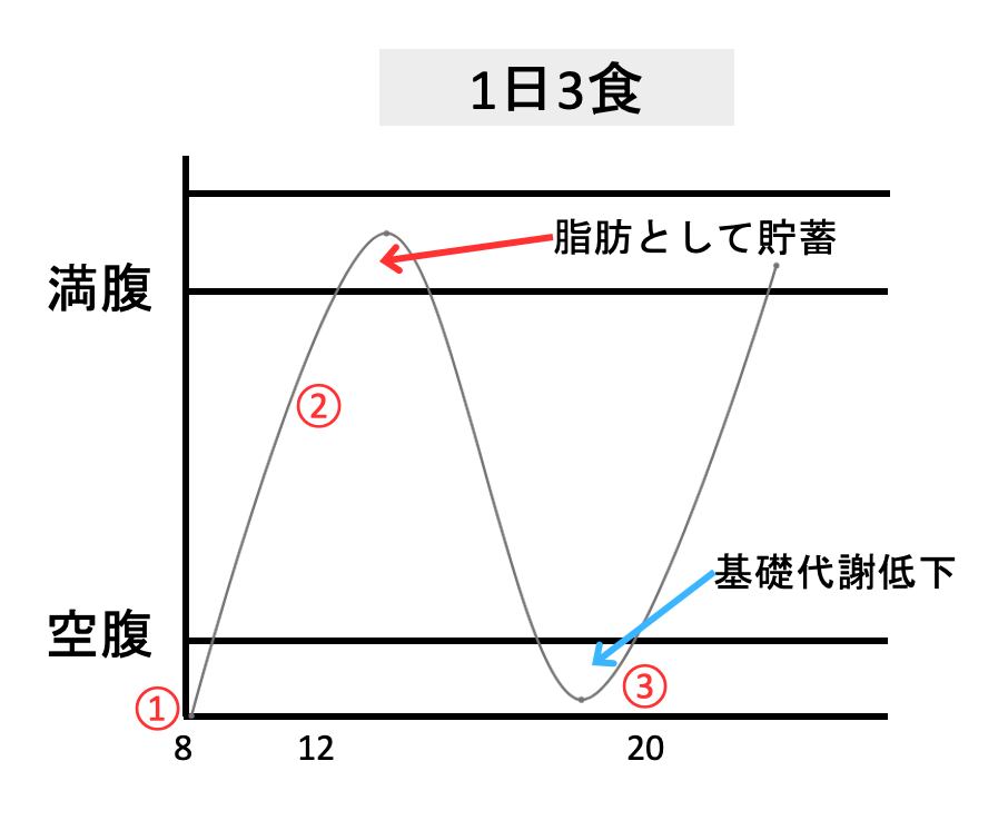 1日3食では、食事と食事の間が長く、血糖値が乱高下します。