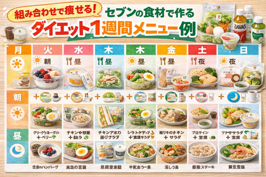 セブン食材で作る1週間メニューは『ローテーション』『PFCのバランス』『満足感の維持』をキーワードに組むと継続しやすいです。