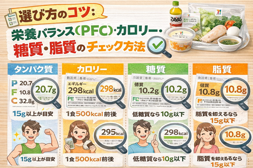 選ぶ際は『糖質量』『たんぱく質』『脂質の質』を確認し、よく噛んで満足感を得ることが大切です。