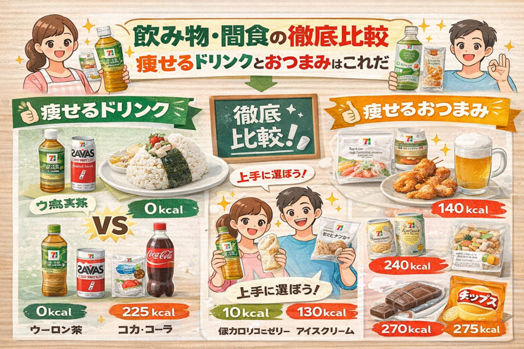 ここでは飲み物のTOPと間食のおすすめを比較し、簡易な比較表と共に具体的な商品タイプを提示します。