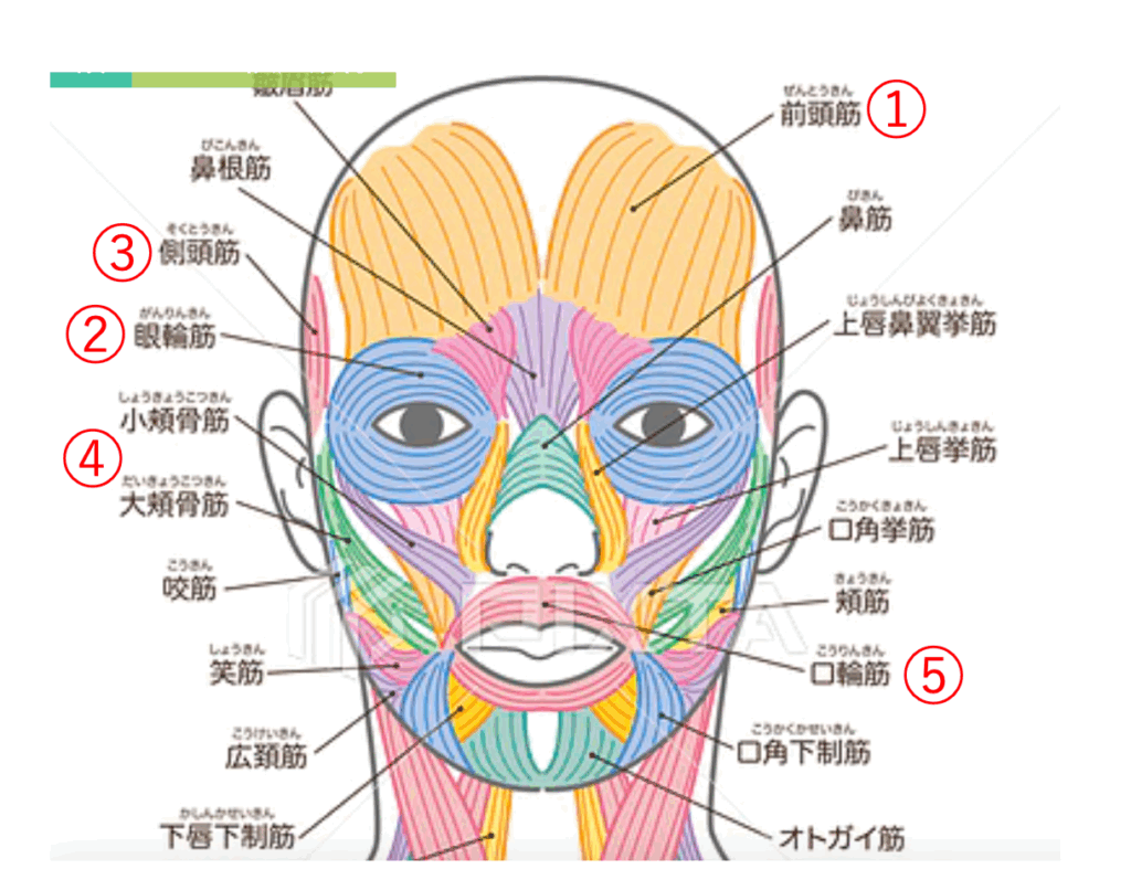 1口輪筋2頬骨筋3眼輪筋4側頭筋5前頭筋